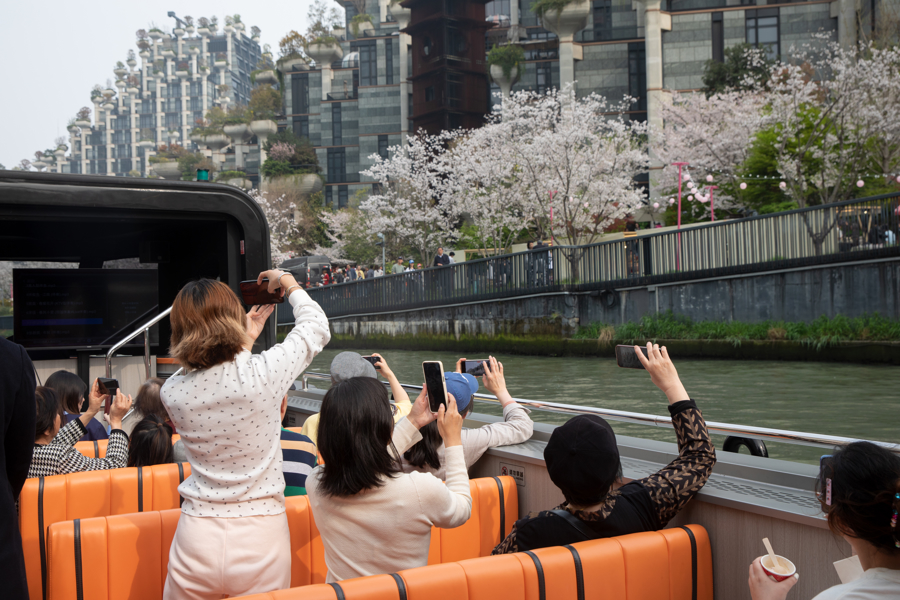 活动时期,全新亮相的樱花季主题游船初次将“娴雅银河”系列船只进行樱花主题逃匿,顶篷开启后可竣事360度无遮挡视线,当游船冉冉行驶于苏州河,两岸通达的樱花与天安千树的“丛林景不雅”相映相衬,为市民带来别样的水上赏樱体验。