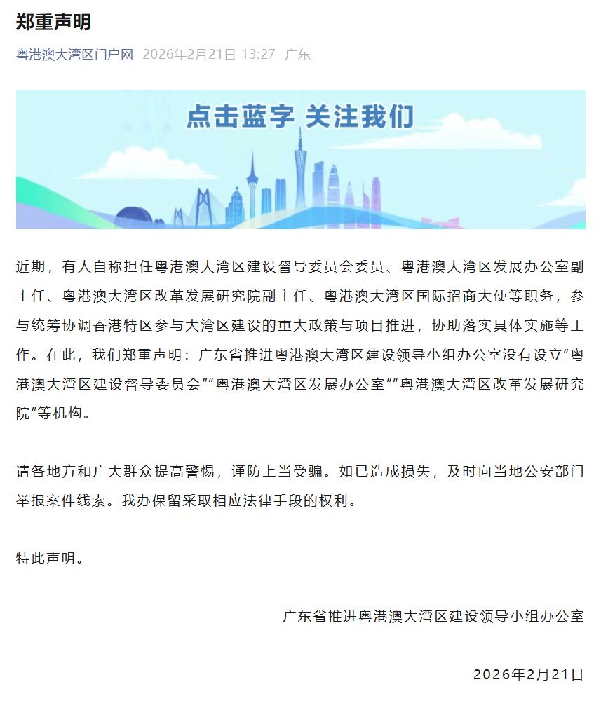 2月21日,广东省鼓励粤港澳大湾区建立指令小组办公室在“粤港澳大湾区学派网”微信公众号发布声明,打假“粤港澳大湾区建立督导委员会”等机构,辅导专家注重上当。
