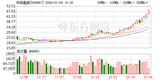 中钨高新股价再创历史新高,该股近期呈不断突破新高之势,近一个月累计有13个交易日股价刷新历史纪录。截至09:31,该股目前上涨1.69%,股价报45.73元,成交914.84万股,成交金额4.15亿元,换手率0.63%,该股最新A股总市值达1042.01亿元,该股A股流通市值664.42亿元。