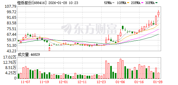 恒烁股份股价创出历史新高,截至9:48,该股上涨6.67%,股价报99.99元,成交量262.49万股,成交金额2.53亿元,换手率4.02%,该股最新A股总市值达83.00亿元,该股A股流通市值65.31亿元。
