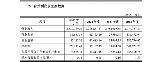 但放在明阳智能自身经营语境中,这笔交易更像是在压力之下的一次转向尝试。2022年至2024年,公司营收从307.48亿元下降至271.58亿元,归母净利润从34.45亿元骤降至3.46亿元。2025年前三季度,虽然营收同比增长近三成,但归母净利润同比仍下滑5.29%,增收不增利的特征明显。