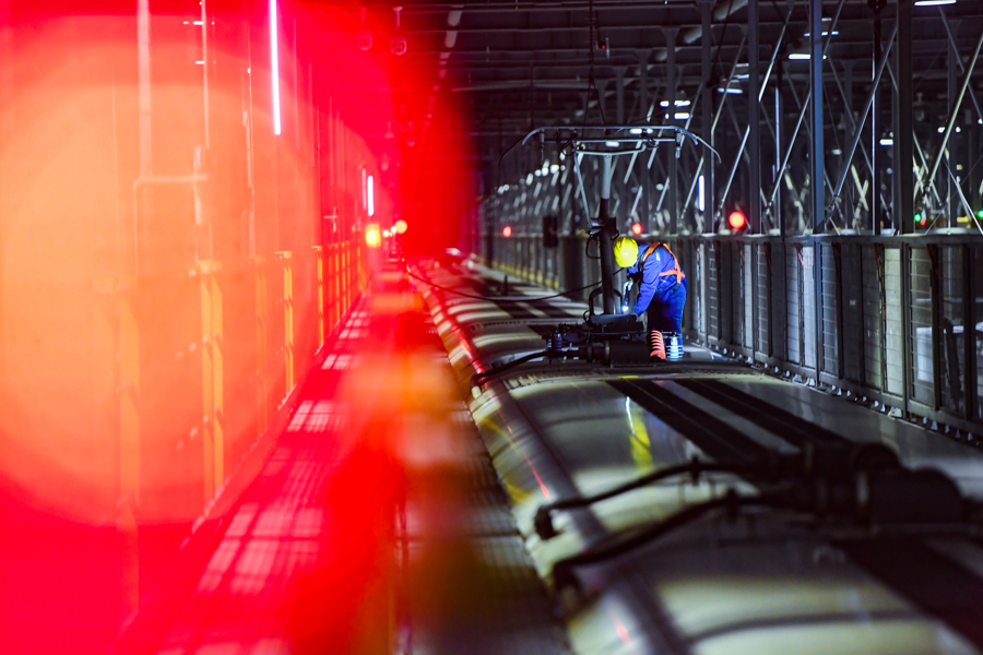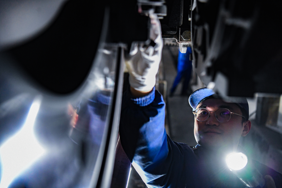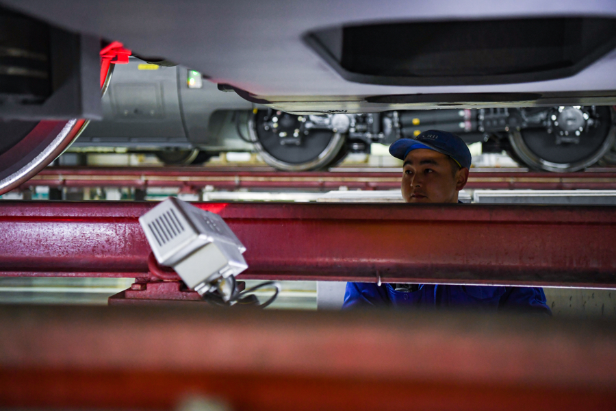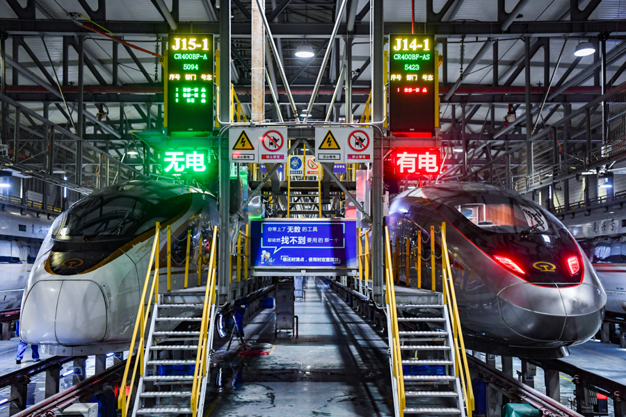 检修库内,光影交错、机声有序,机械师的身影穿梭在一列列动车组之间,与各类智能设备并肩作战,开启了寒夜中的检修作业。