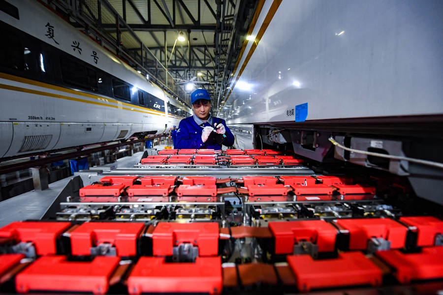 地勤机械师正在对动车组蓄电池进行维护保养。