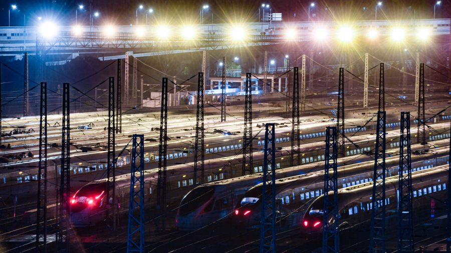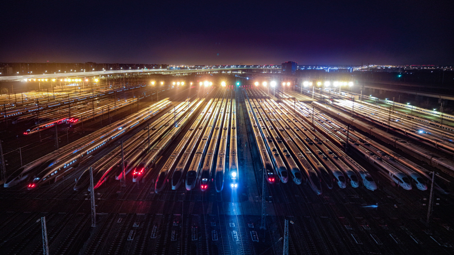 凌晨的虹桥动车所万籁俱寂,检修完毕的动车组在存车线上整装待发。