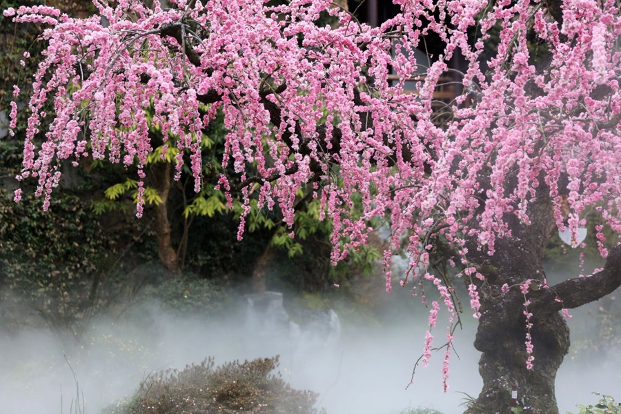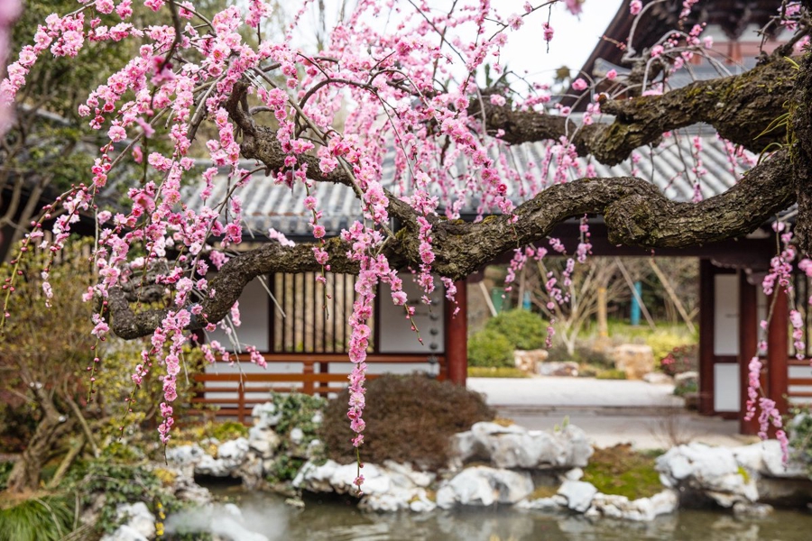 据悉,垂枝梅与普通梅花差异很大,一是特别高,二是形态完全不同,而这种奇异的形态主要靠高水平的园艺修剪才能长成。
