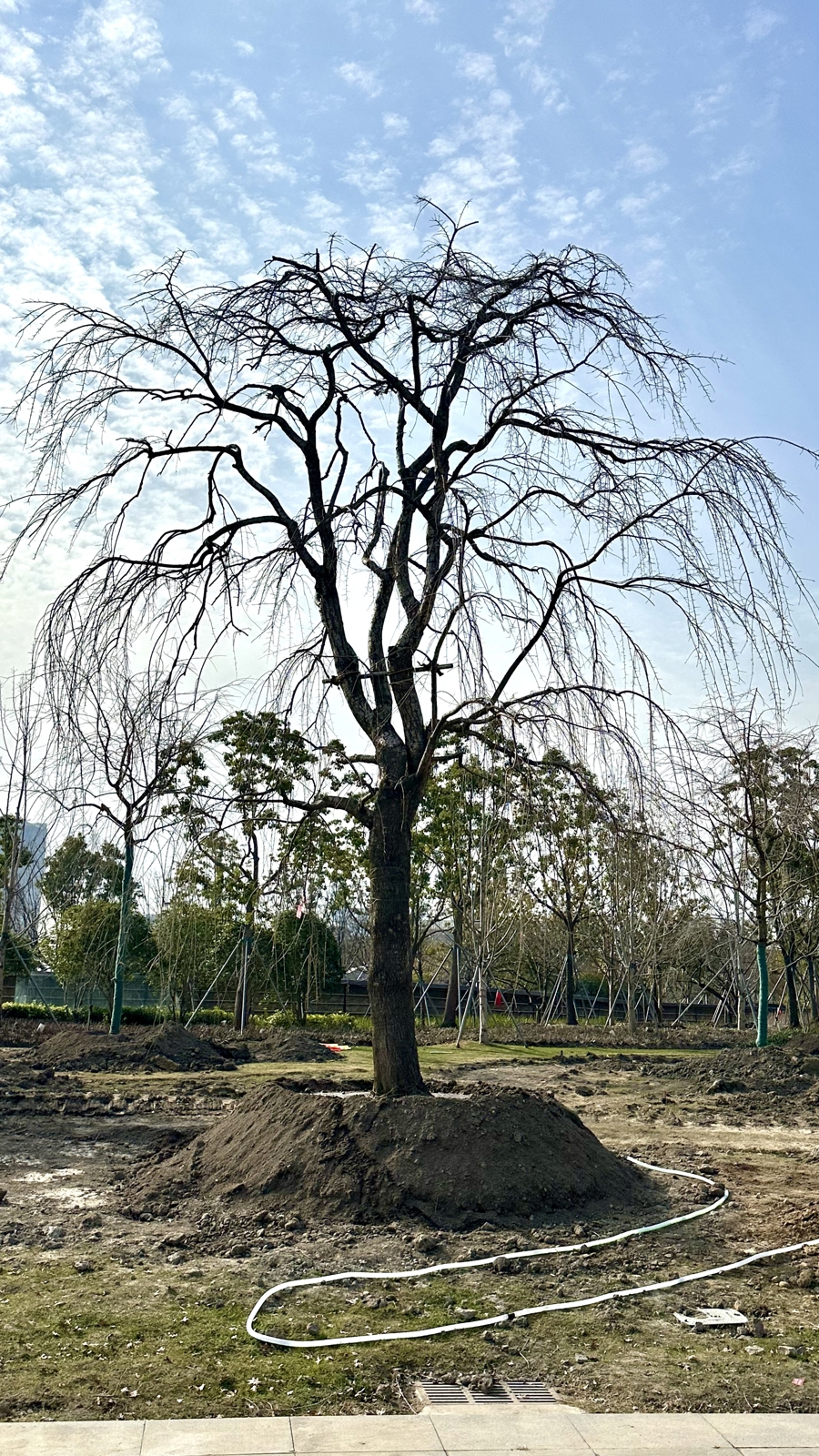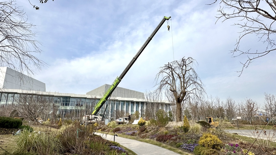 在现场,新民晚报记者还看到了来自浙江人文园林的盆景大师攀爬在树上,用盆景手法处理树木枯枝:“我们希望打造‘枯荣并济’的感觉,将断枝借势做出舍利感。原先应用在盆景上的手法,现在被用到了苗木上。”