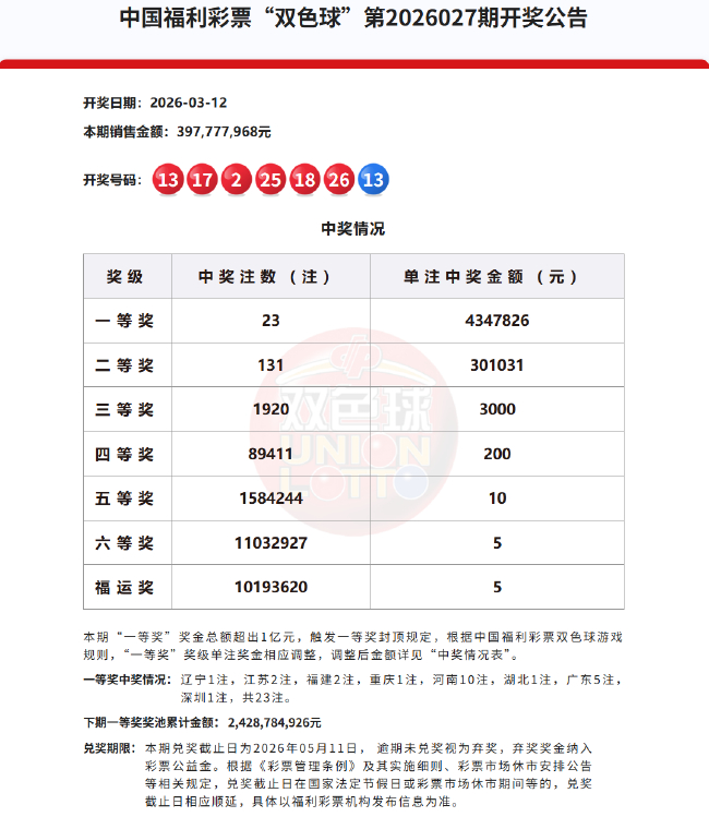 北京技能2026年3月12日,福彩双色球第26027期开奖,当期开奖号码为红球02 13 17 18 25 26,蓝球13。值得一提的是,本期一等奖井喷23注,奖金总和超出1亿元,触发一等奖封顶轨则。阐明中国福利彩票双色球游戏法则,“一等奖”奖级单注奖金相应补救,补救后单注奖金为434万元。二等奖开出131注,单注奖金30.1万元。此外,信钰证券因开奖前奖池高于15亿,增设5元福运奖(射中3枚红球即中奖),共开出10193620注。本期双色球销量为3.97亿余元,奖池余额24.28亿余元。