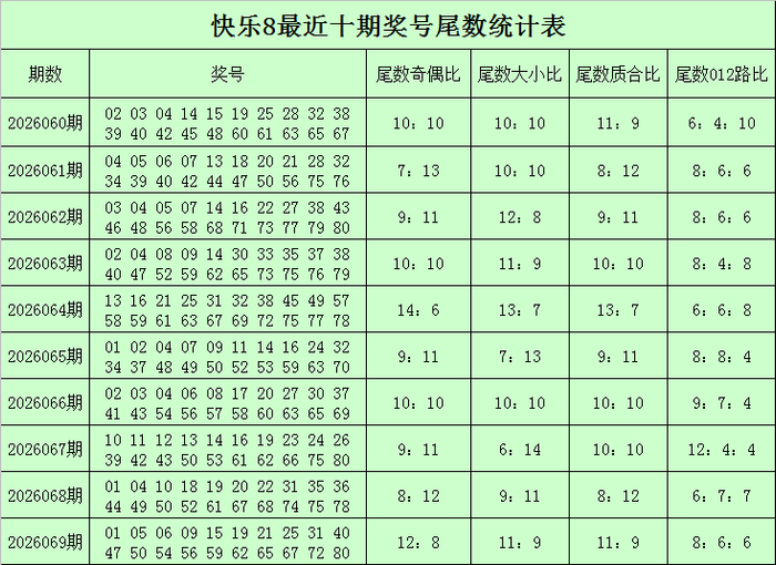 福彩自满8第2026069期开奖归来:01 05 06 09 15 19 21 25 31 40 47 50 54 56 59 62 65 67 72 80,其中奖号余数奇偶比为12:8,余数012路比为8:6:6,余数大小比为11:9,余数质合比为11:9。