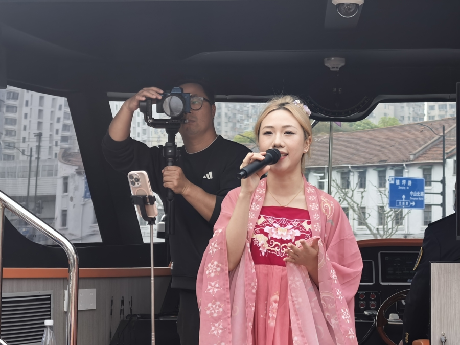 歌手在游船献艺唱。