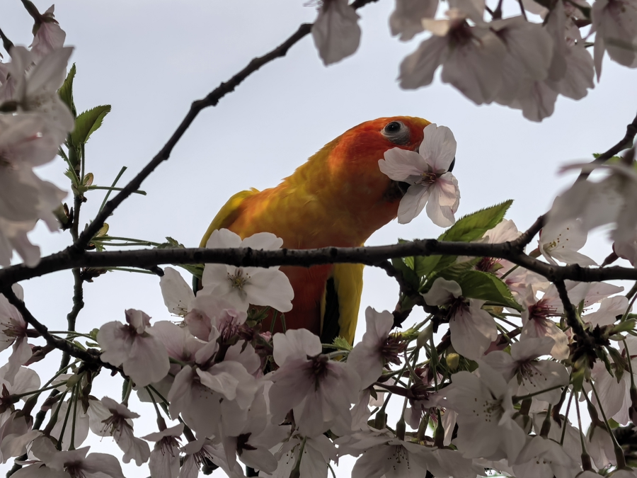 樱花树上的鹦鹉成为照相钦慕者的焦点。