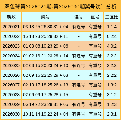 连号走势分析:近10期中有6期开出连号,比例为60.00%,上期开出1组连号10,11,本期分析连号组合开出:27,28。